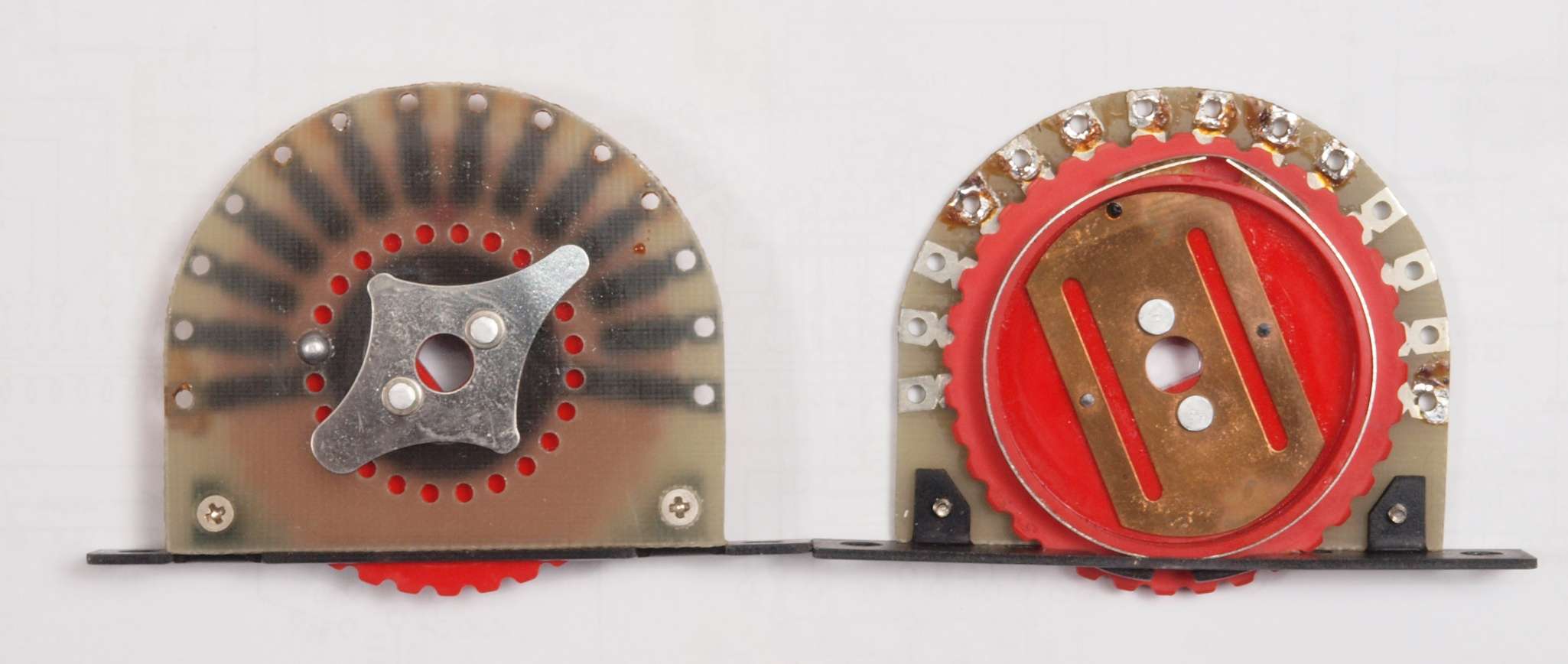 | E5. 真空管ピン選択ホイール、横から見る、特殊な構造。カシメのアルミピン2本が見える。 | |||||||||||||||||||||||||||||||||||