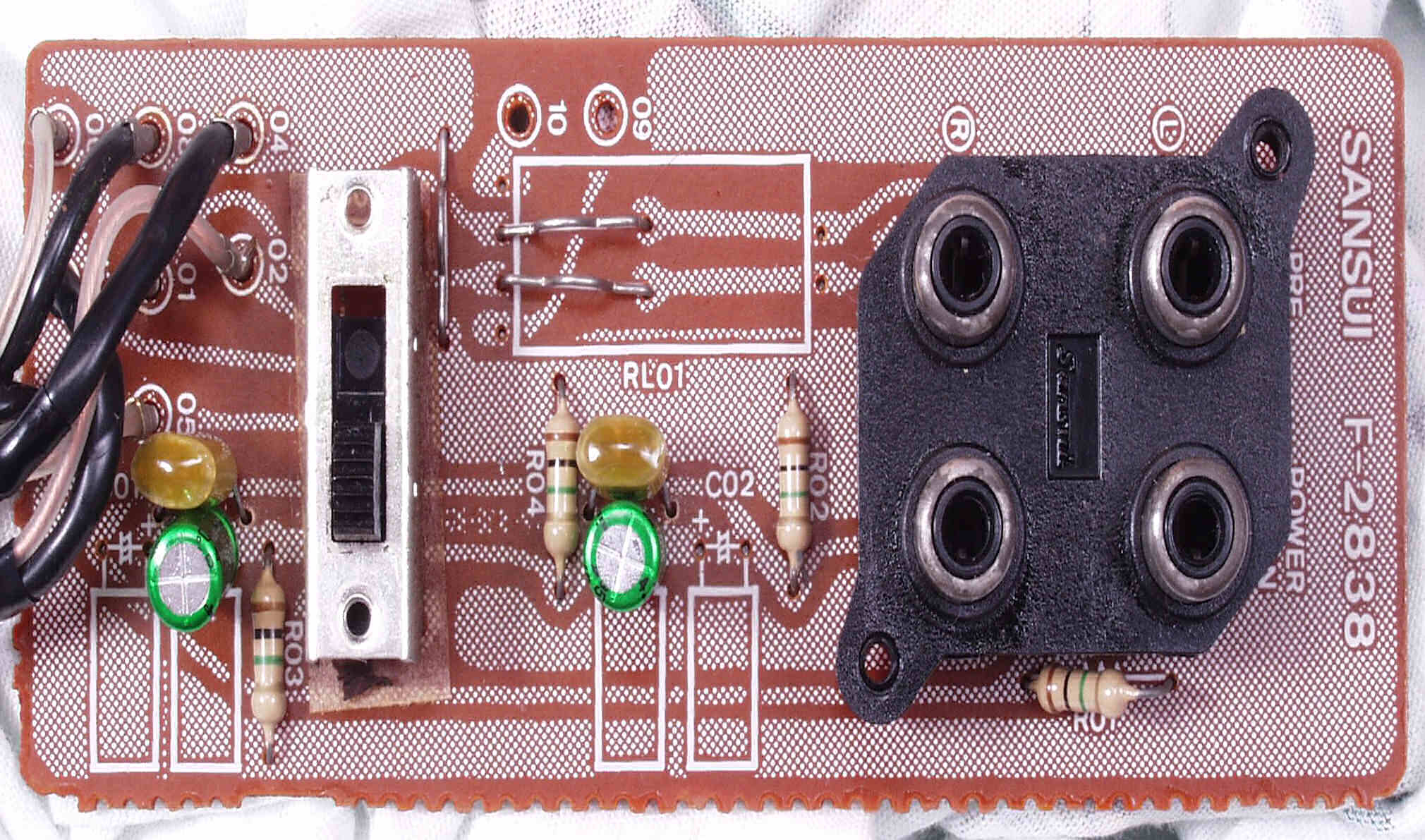 初段FET(電界効果トランジスター)2個、半固定VR4個、電解コンデンサ−20個、抵抗6個、TR(トランジスター)6個交換