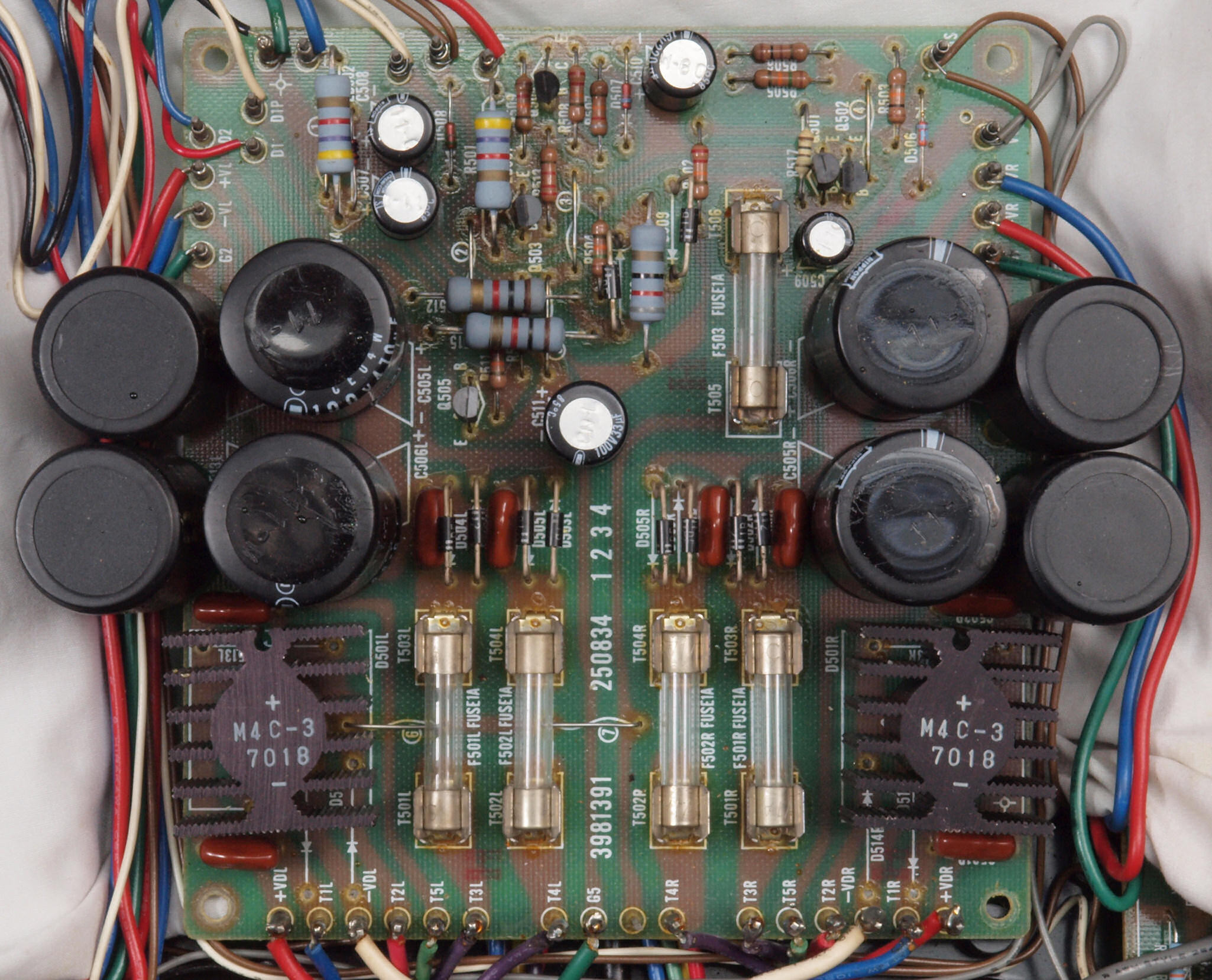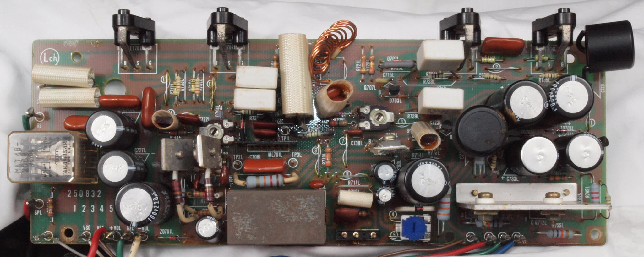 | C22. 修理後 L側ドライブ基板。 初段FET(電界効果トランジスター)、バランス/バイアス調整用半固定VR3個、SP接続リレー交換 ヒューズ入り抵抗全部、電解コンデンサー11個、TR(トランジスター)2個交換、モジュール修理交換部品は除く。 |