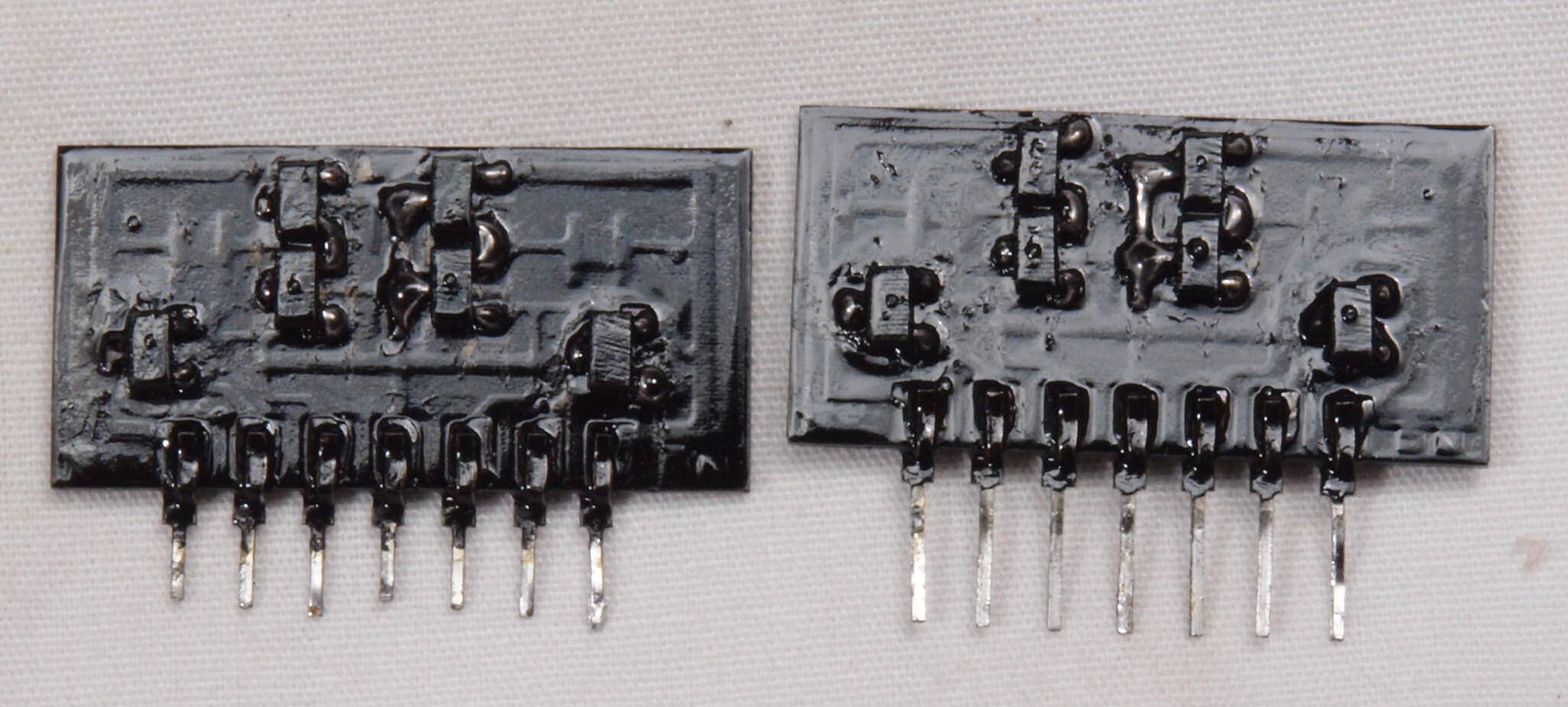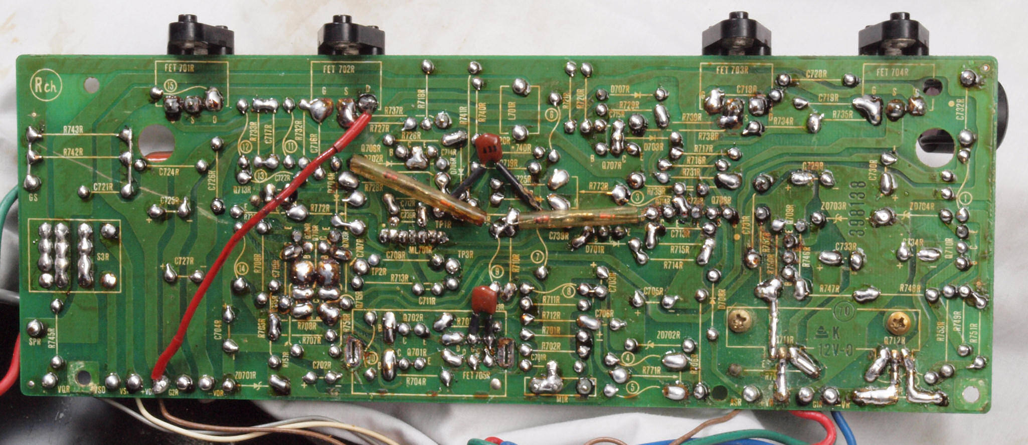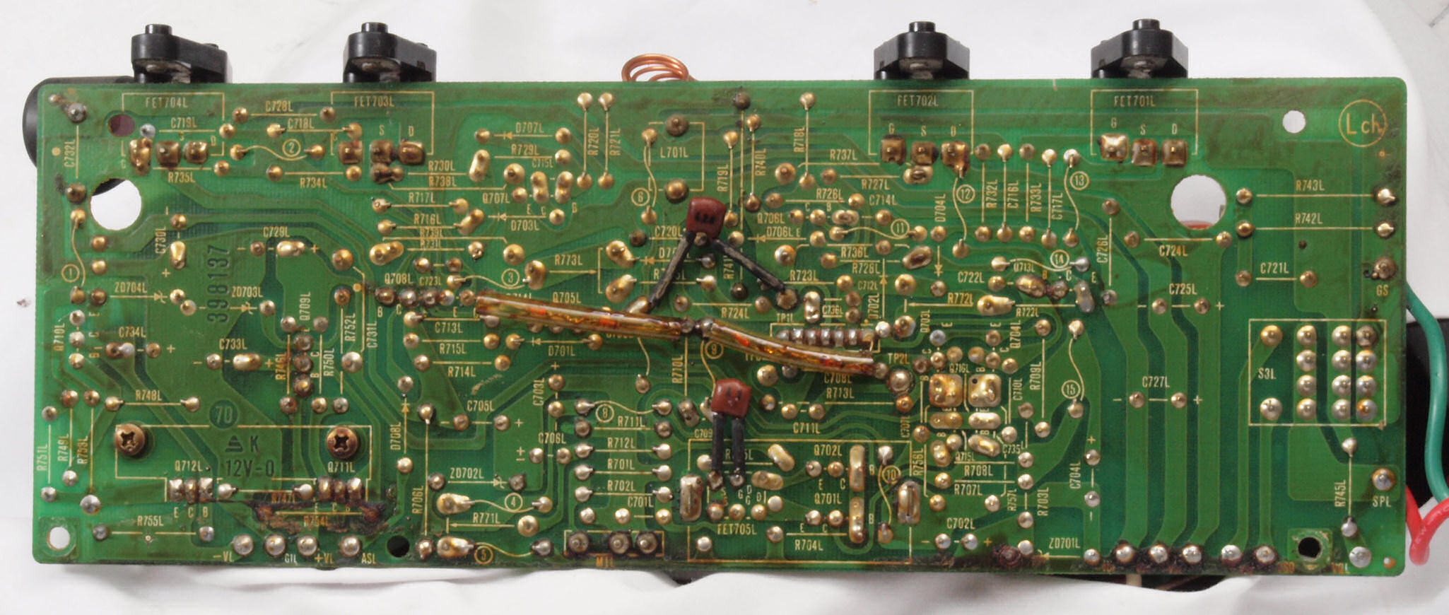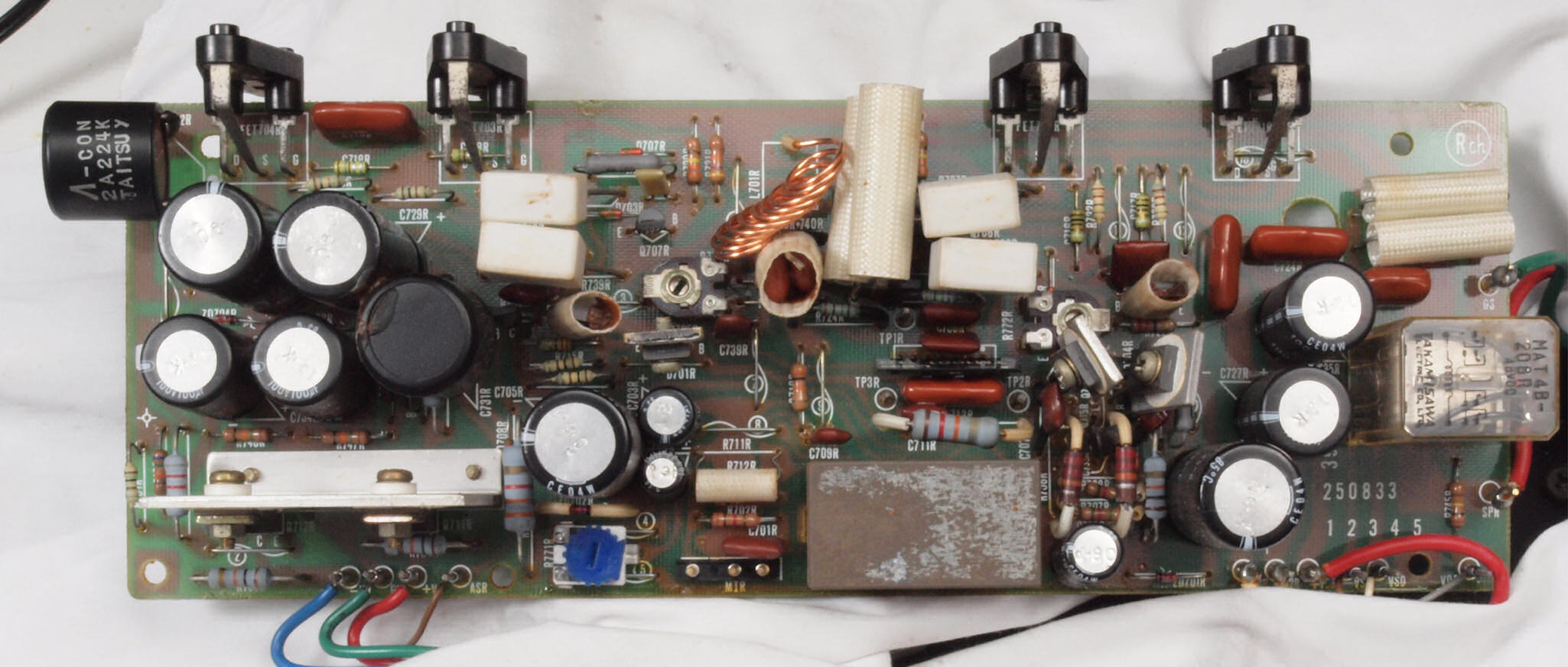 | C43. 修理中 RLモジュール裏。 TR(トランジスター)6個交換し、洗浄後軽くラッカーを吹く。 |