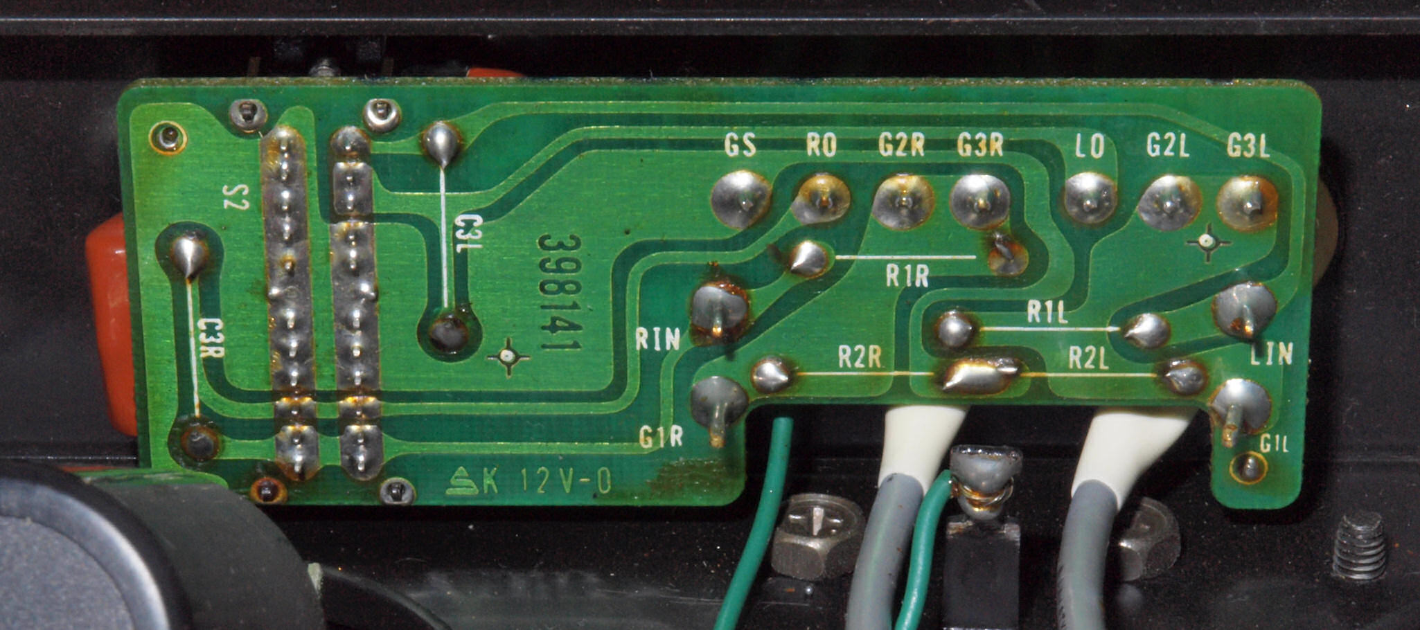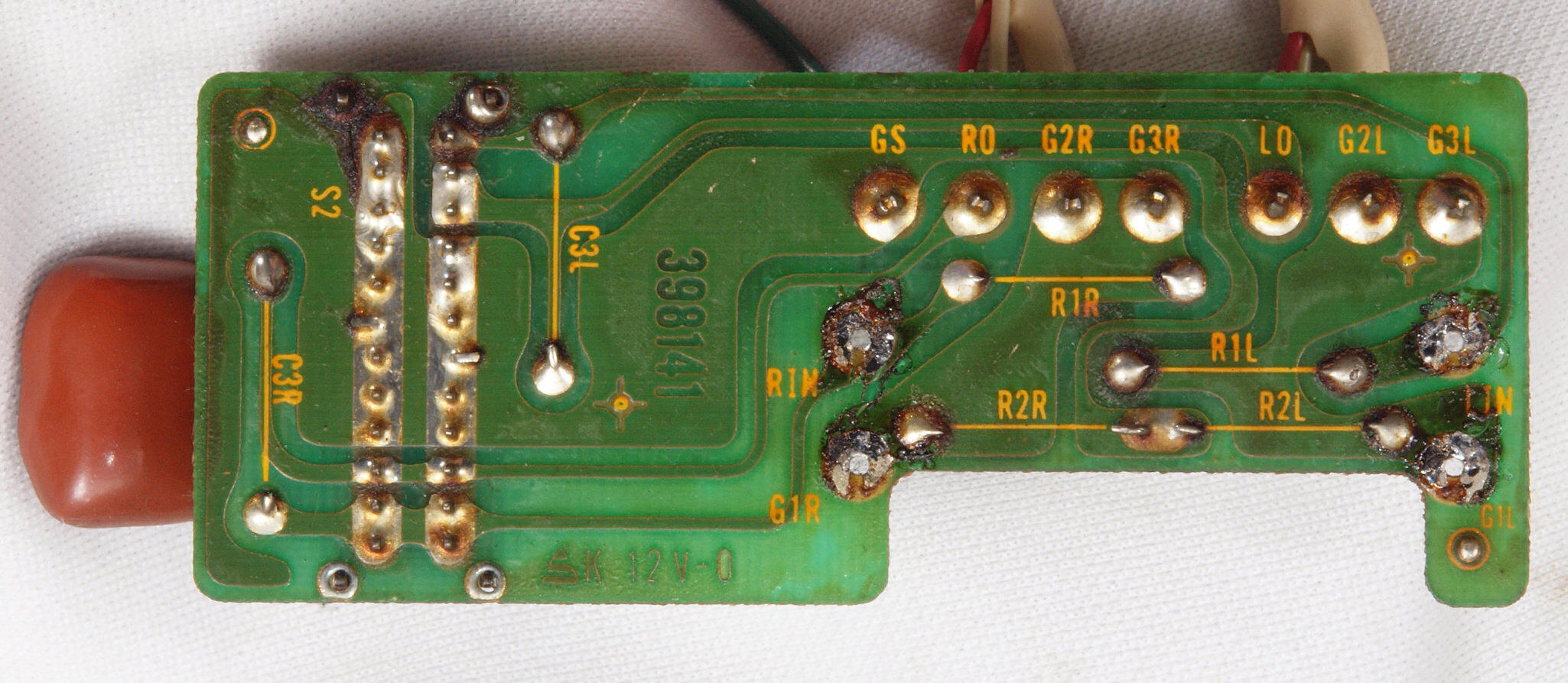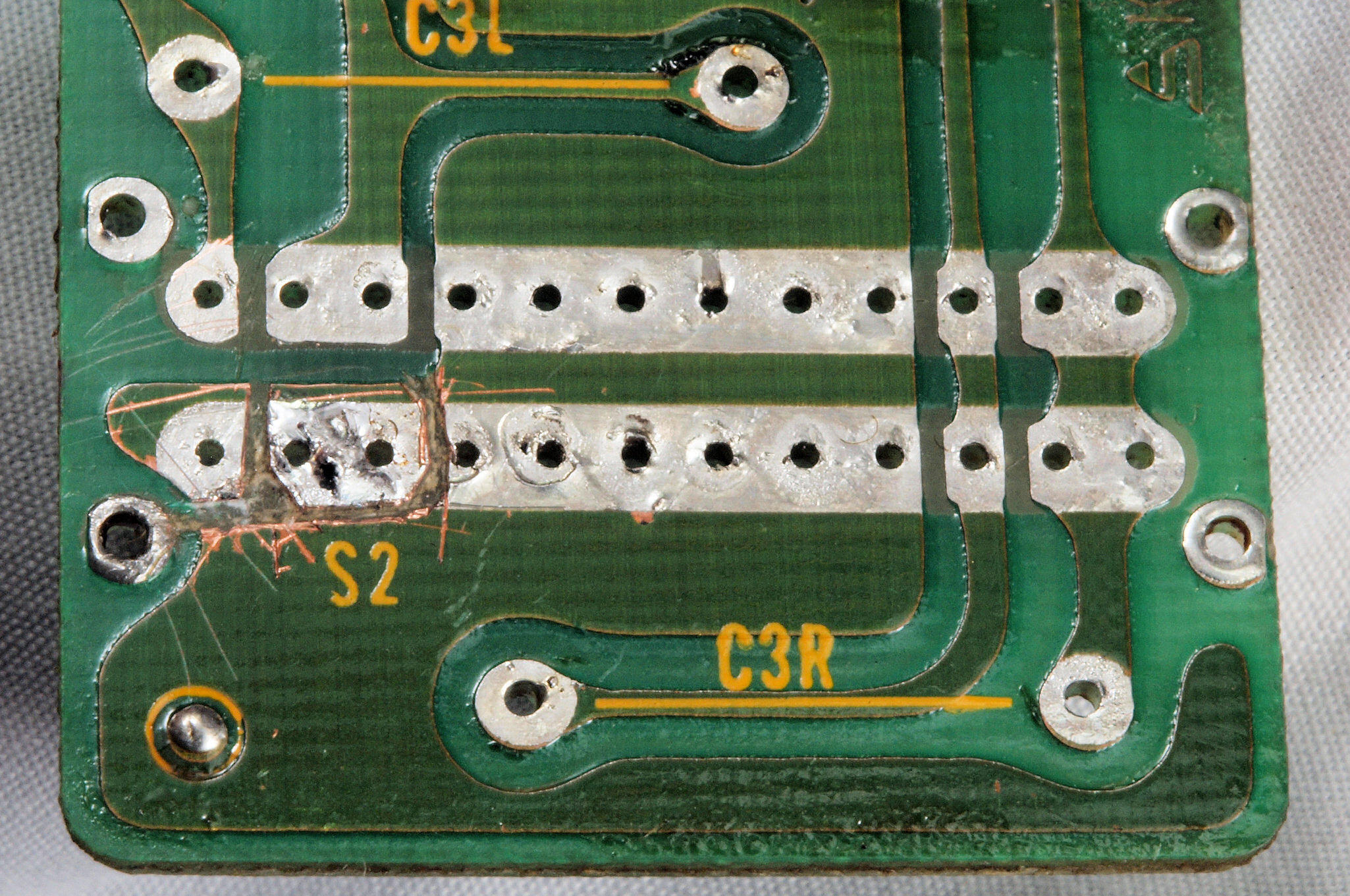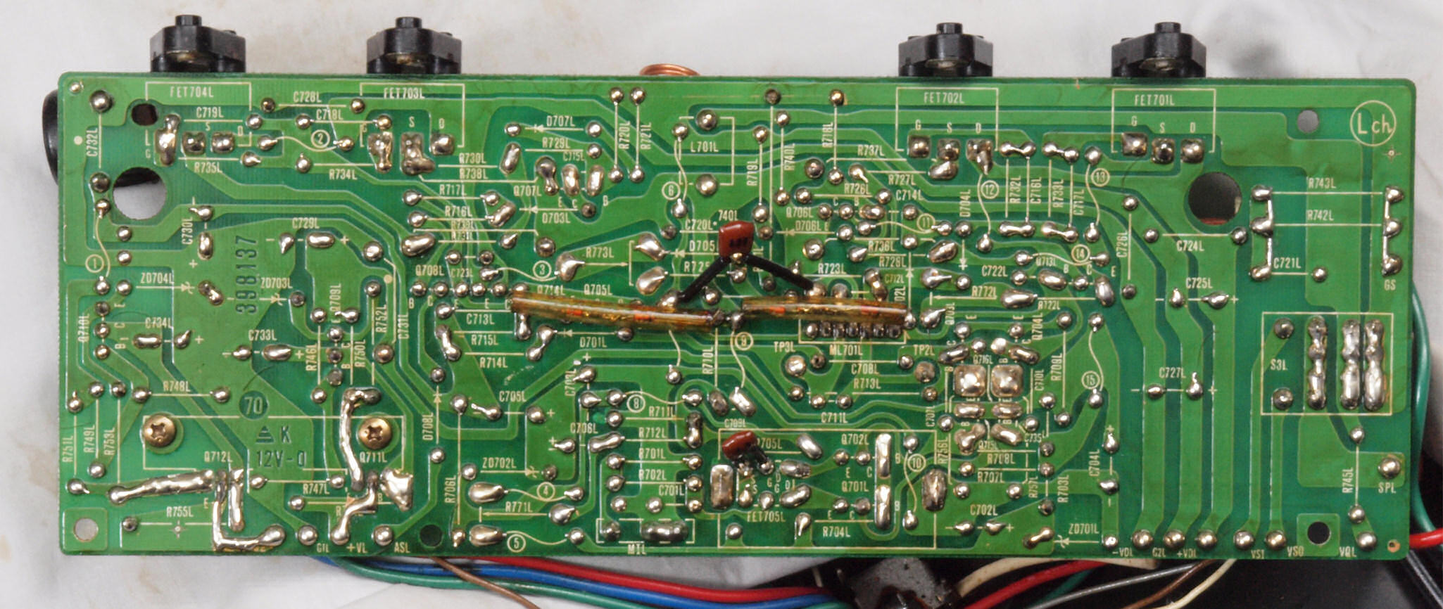 | C74. 修理中 入力RCA端子基板裏 L側もW−SWにする為、基板改造。 |