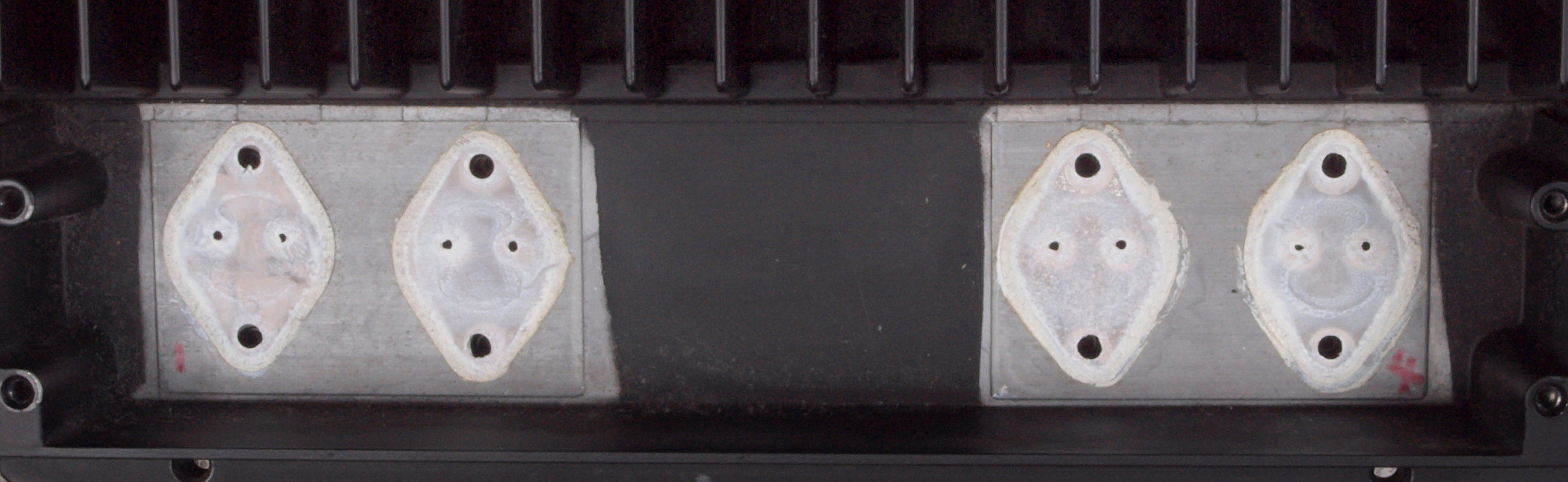 | C32. 修理中 R側終段FET(電界効果トランジスター)、取り付け絶縁マイカー。 熱伝導の良い「シリコン製絶縁シート」は比誘電率が、シリコンオイル=2.60〜2.75、雲母=5〜8と2倍の開きがあり、高域特性に影響が出るので、現在は未採用。 |