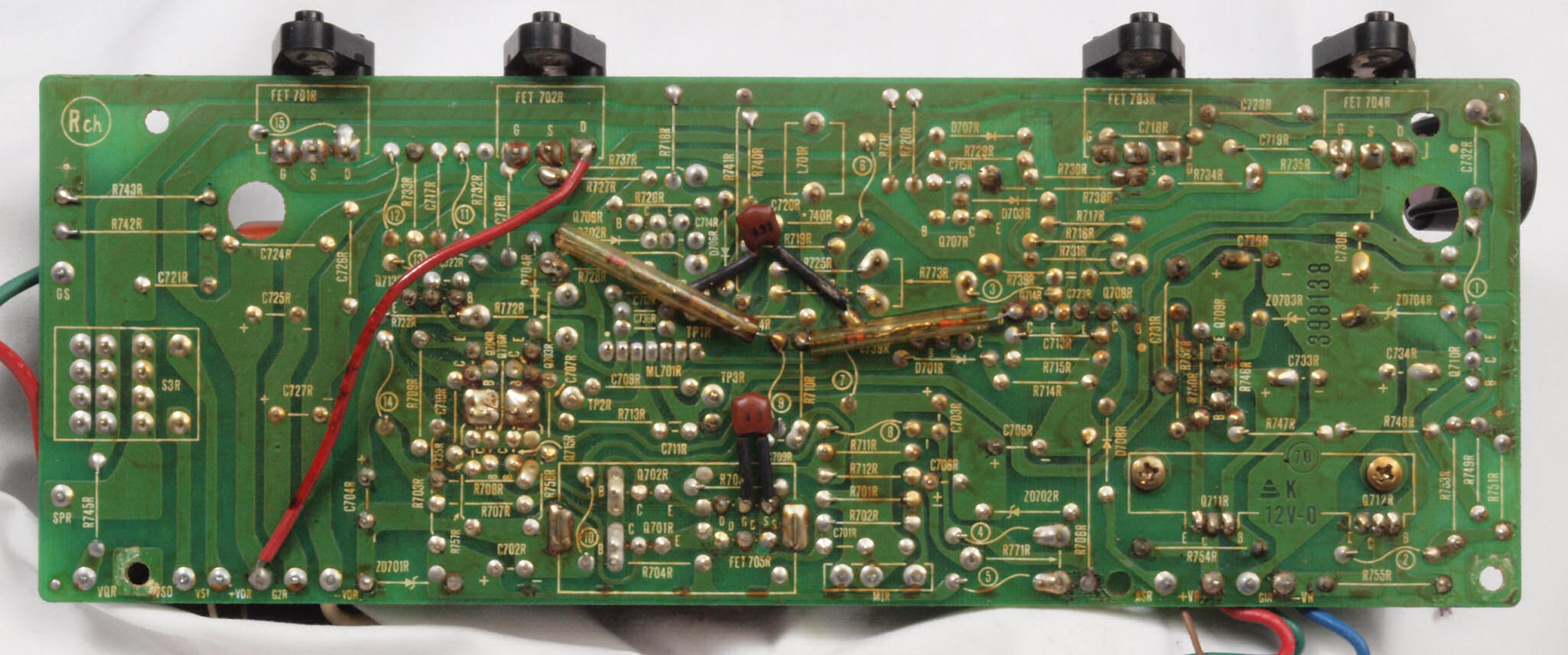 | C12. 修理後 R側ドライブ基板。 初段FET(電界効果トランジスター)、バランス・バイアス調整用半固定VR3個、SP接続リレー交換 ヒューズ入り抵抗全部、電解コンデンサー11個、TR(トランジスター)2個交換、モジュール修理交換部品は除く。 |
