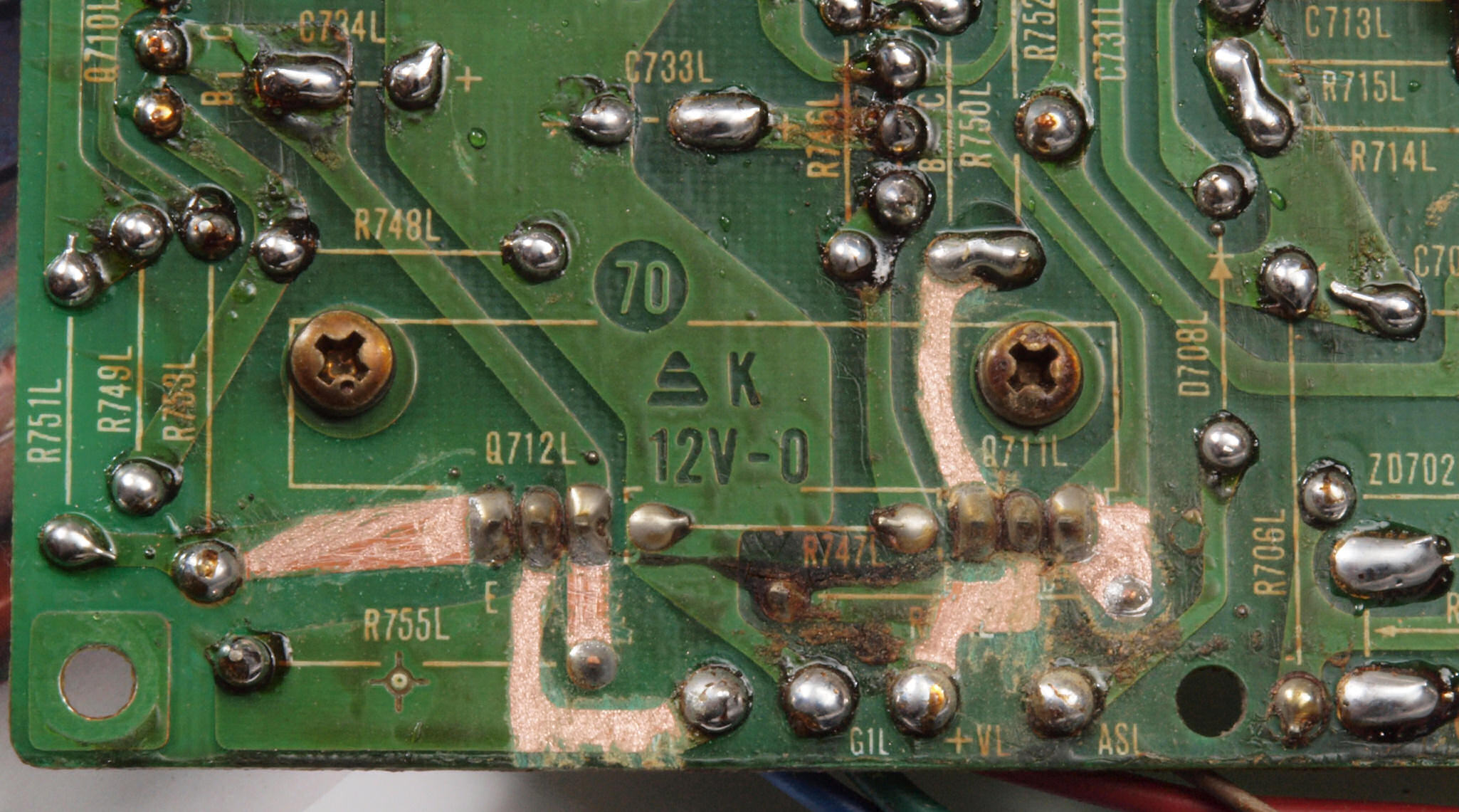| C24. 修理中 L側ドライブ基板裏 定電圧TR(トランジスター)の足の銅箔を広げる。 |