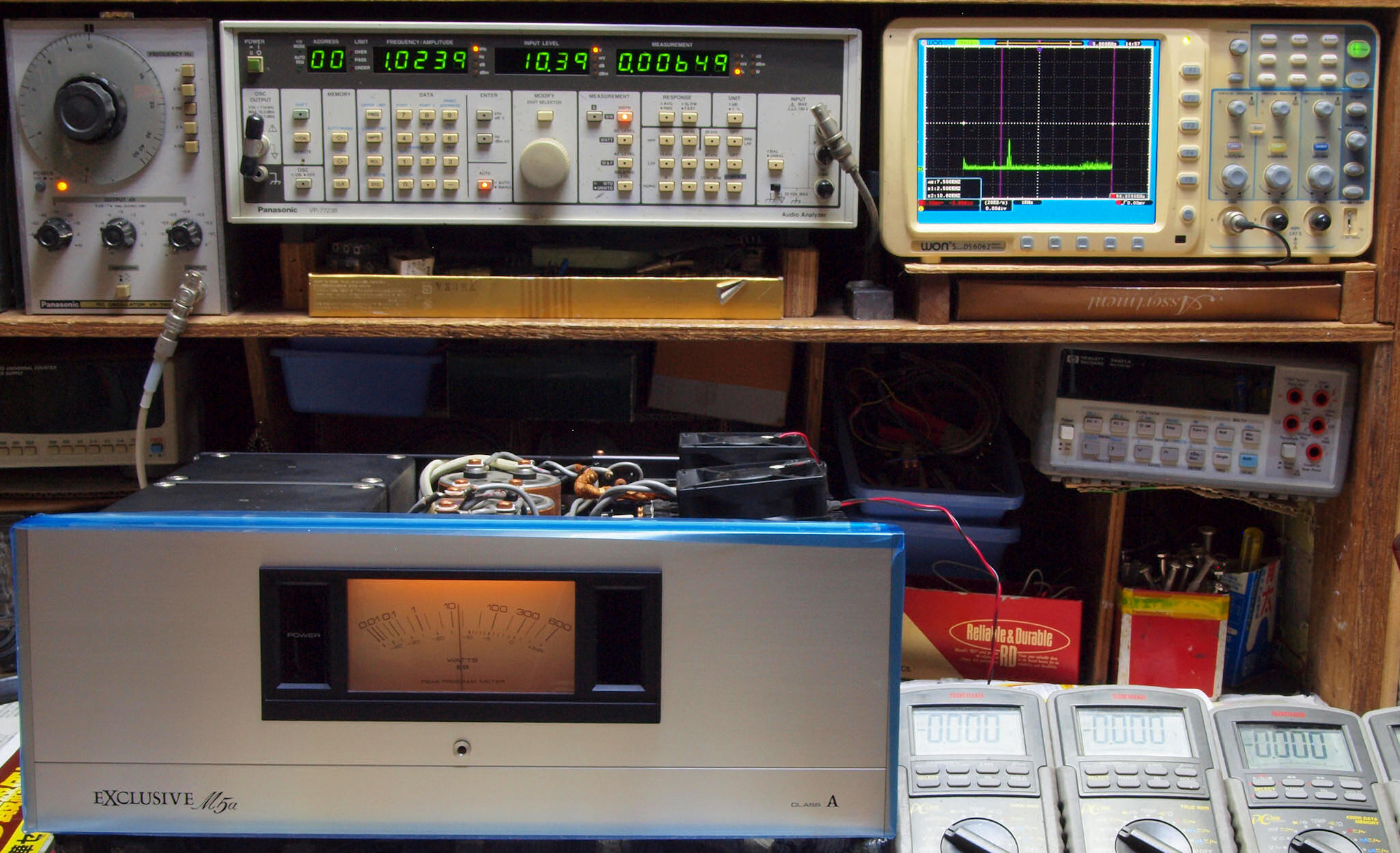 左端 オーディオ発振器 VP−7201A より50Hz〜100kHzの信号を出し(歪み率=約0.003%)、ATT+分配器を通し、AMPに入力。