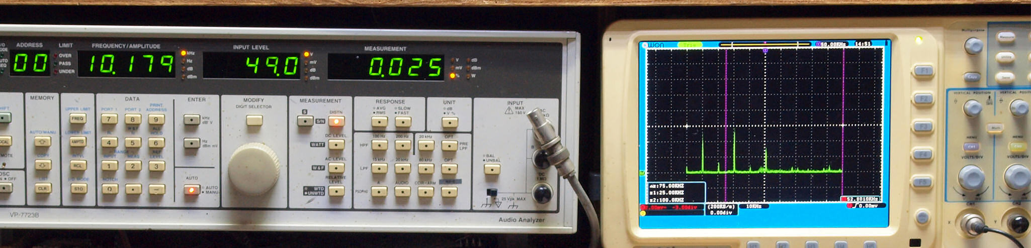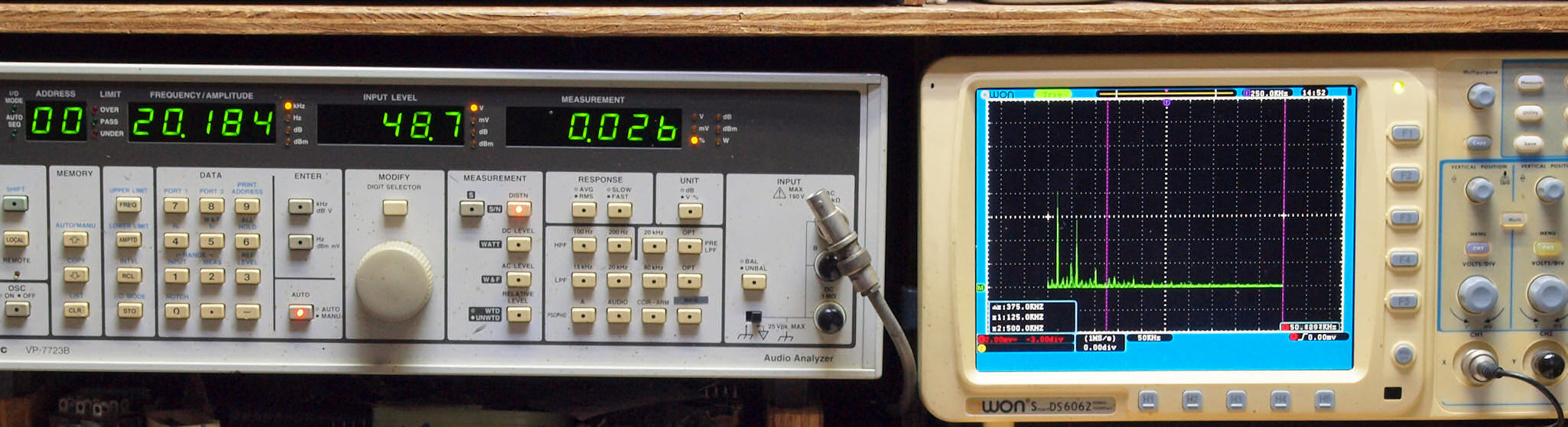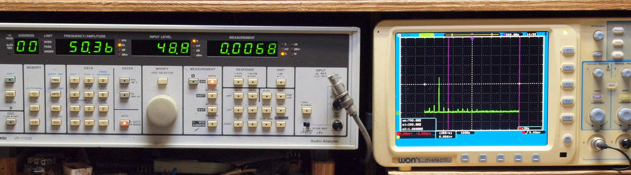 右端 VP−7723Bの基本波除去出力を「owon SDS8202(200MHZ)」で「FFT分析」表示。