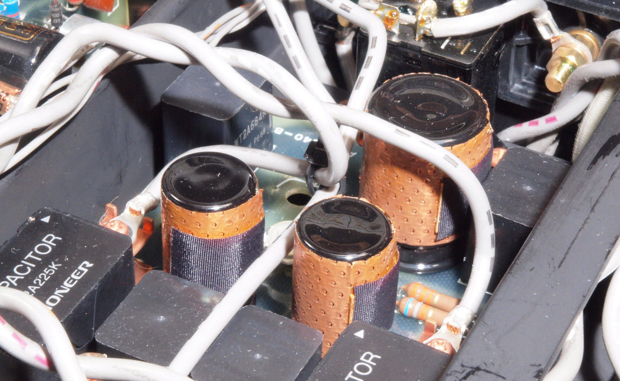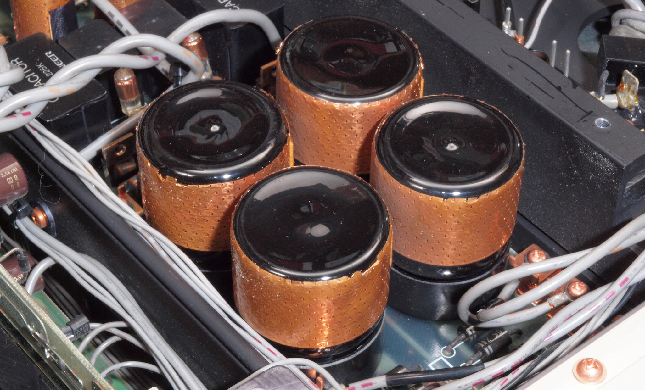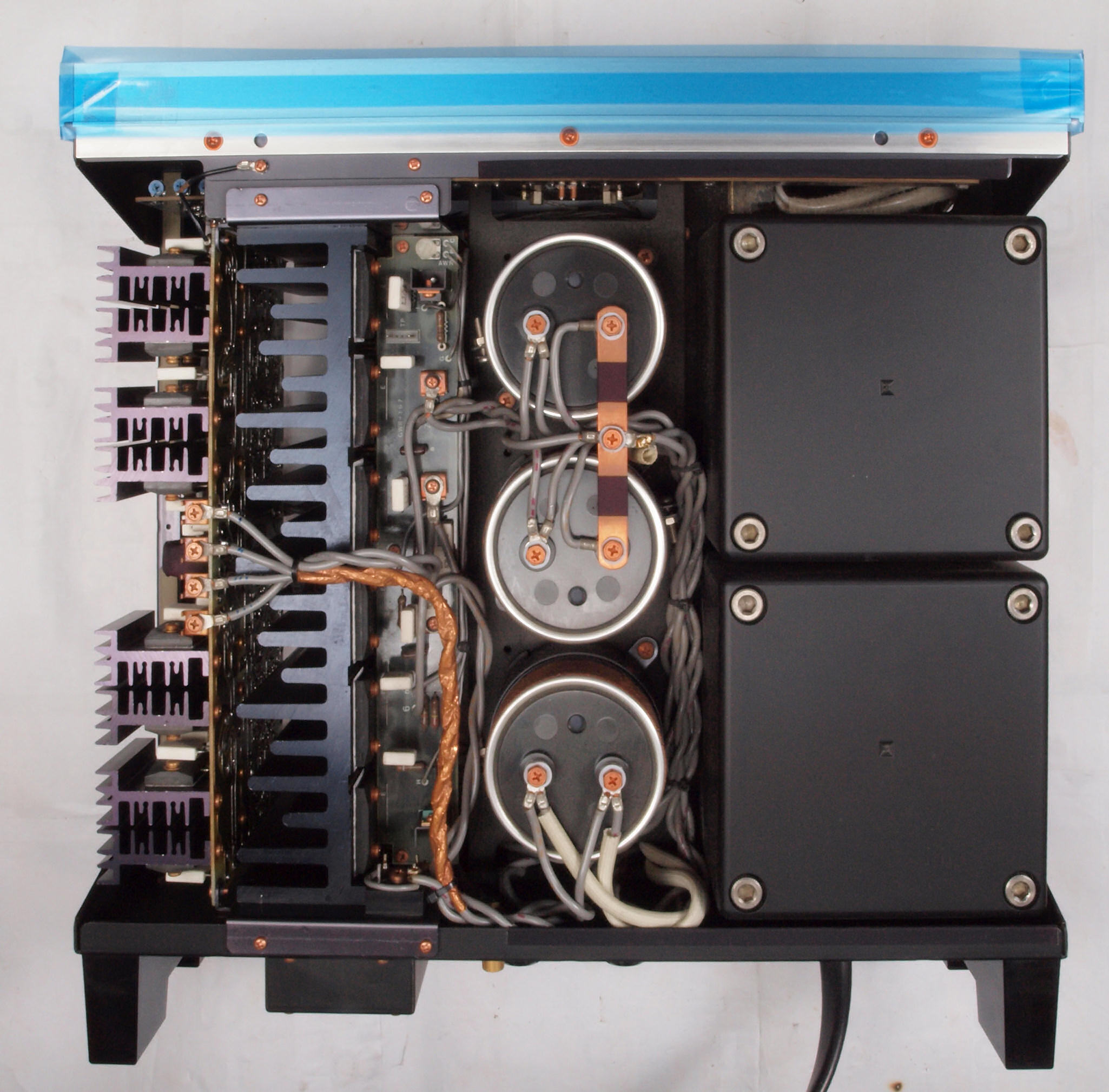 A32. 点検中 木ケースから取り出し、上から見る。 終段電源ブロック電解コンデンサーに巻いた銅箔テープ。