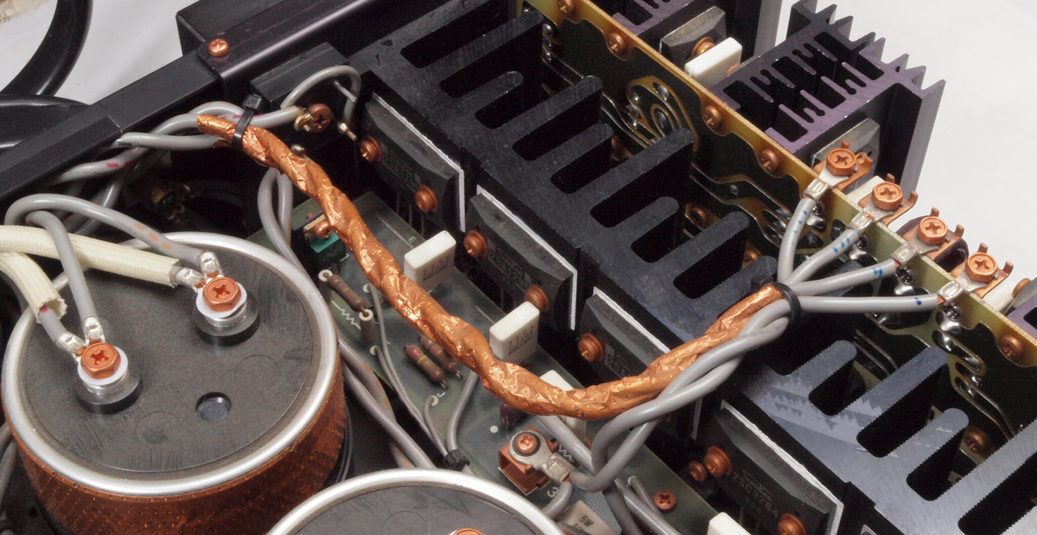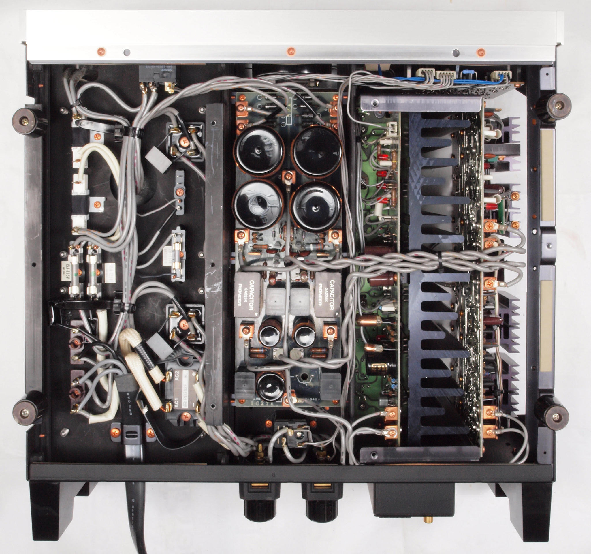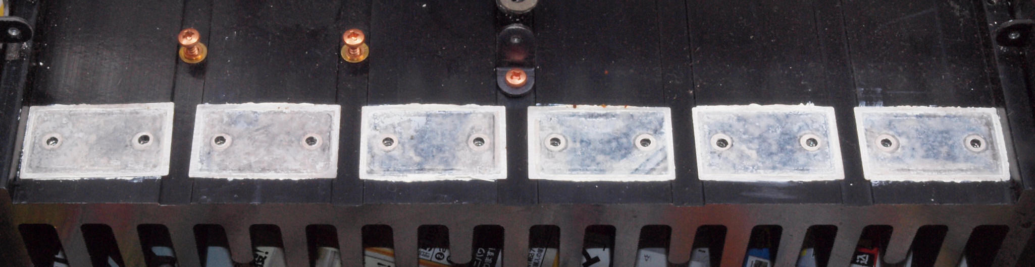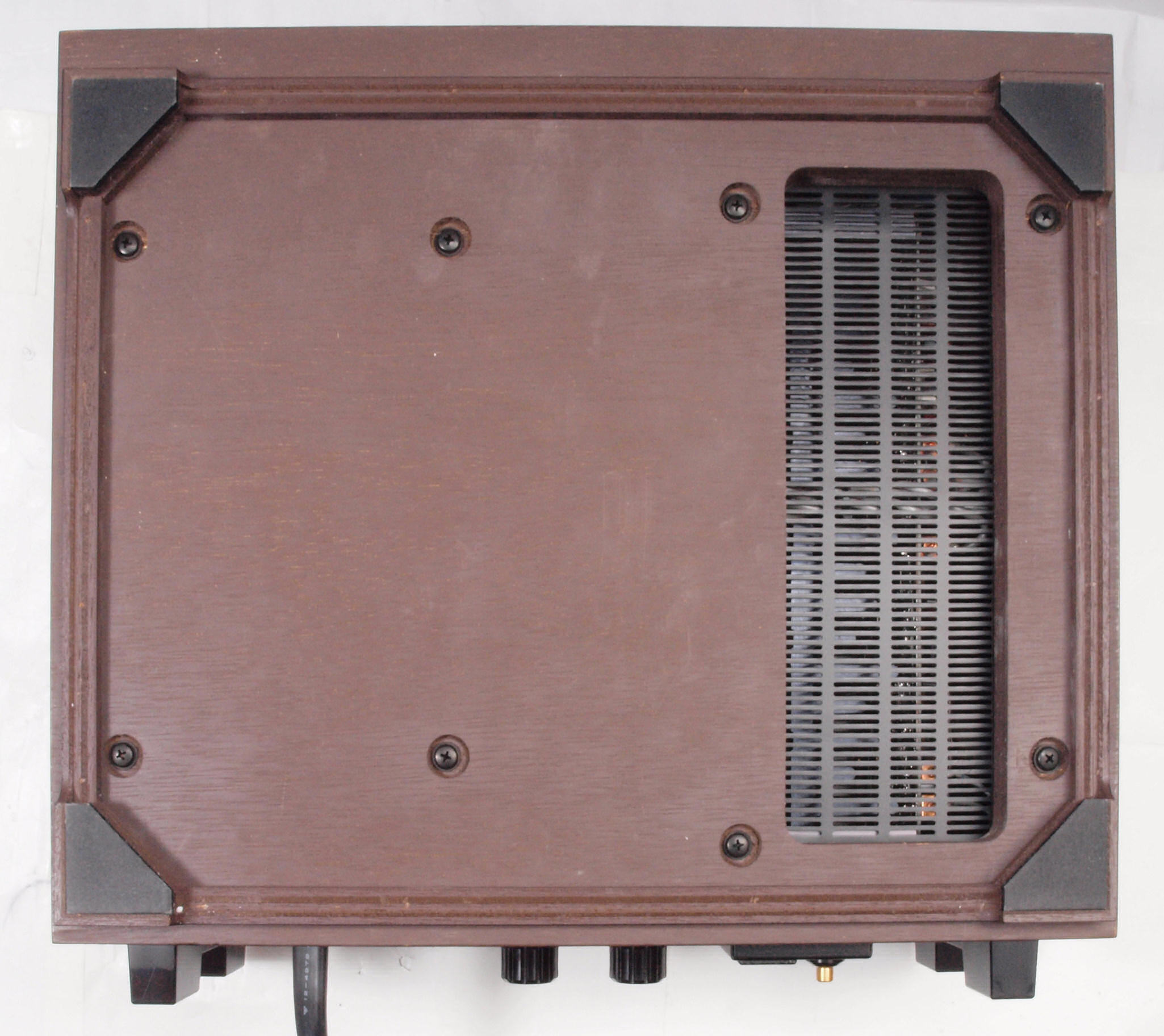 A32. 点検中 木ケースから取り出し、上から見る。 終段電源ブロック電解コンデンサーに巻いた銅箔テープ。