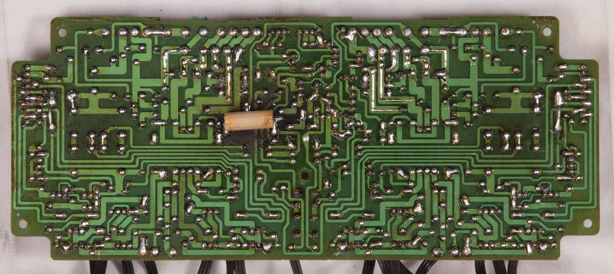 | C54. 修理(半田補正)後 EQ−AMP(equalize-amplifier)基板裏。 さらにコンデンサー6個追加。 半田を全部やり直す。 |