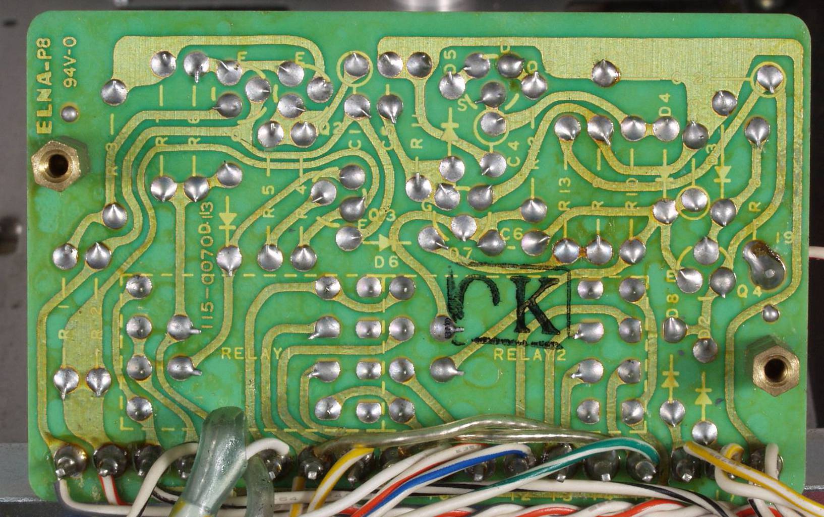 | C3B. 修理後 L側−AMP基板裏 電解コンデンサー4個、半固定VR2個、フイルムコンデンサー2個交換 リレー2個交換 電解コンデンサー2個追加 |