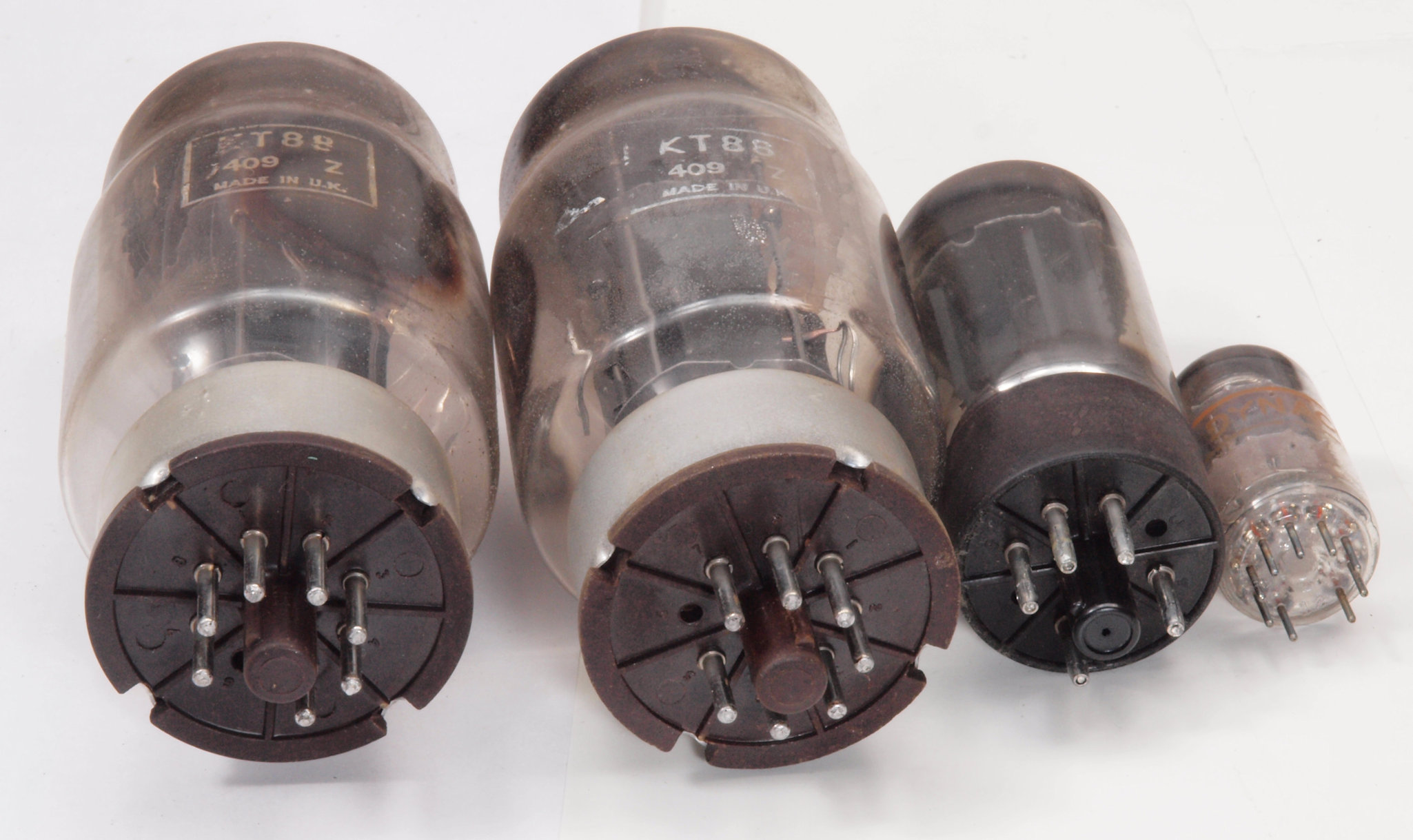 | U3. 予備真空管G.E.C. KT88、左から 1、2、3,4。 KT−88 相互コンダクタンス=11500μmho 「Ep=250V、Esg=250V、Eg1=−15V、Ip=140mA」(インプレス オーディオ用真空管マニアルより) |